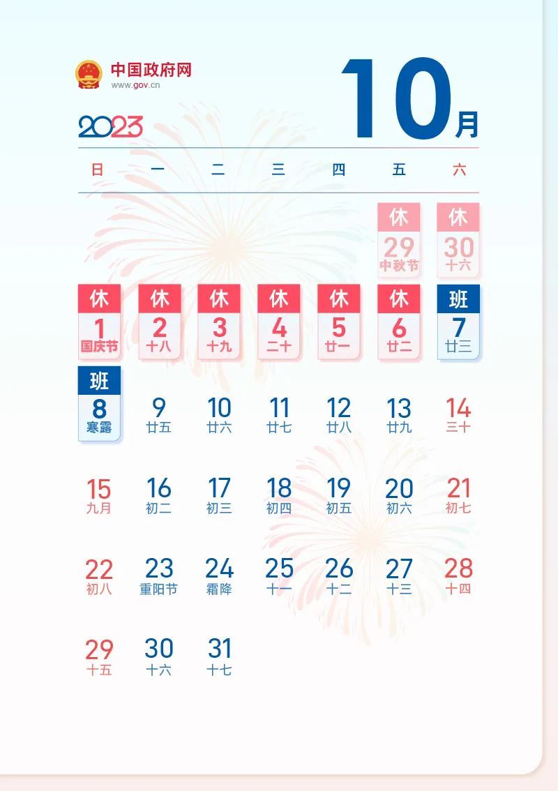 放假時間:2023年9月29日-10月6日共放假8天,2023年10月7日恢復正常上班。